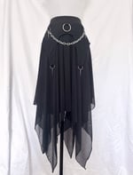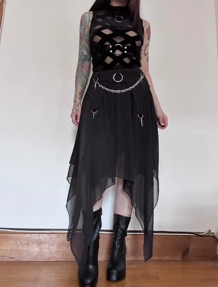Asymmetrical mesh skirt embellished with silver hardware and chain detachable chain details. Has underlayer skirt